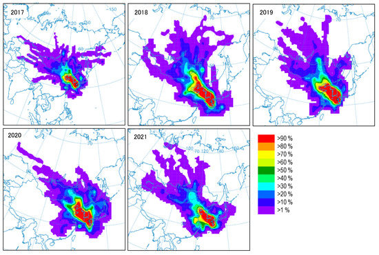 Frequency of residence of back trajectories in a grid cell in autumn calculated by HYSPLIT Model of the National Oceanic and Atmospheric Administration, USA. The analysis period was set from 29 September to 3 November in each year.