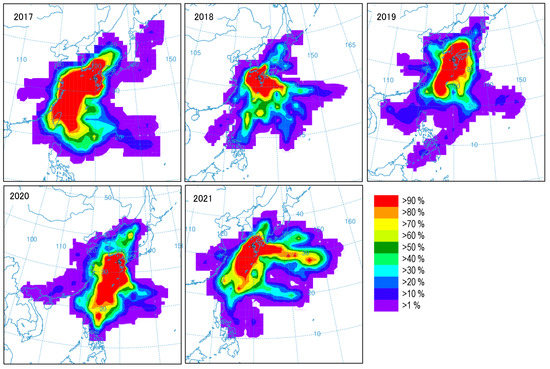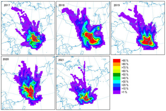 Frequency of residence of back trajectories in a grid cell in spring calculated by HYSPLIT Model of the National Oceanic and Atmospheric Administration, USA. The analysis period was set from 29 March to 3 May in each year.