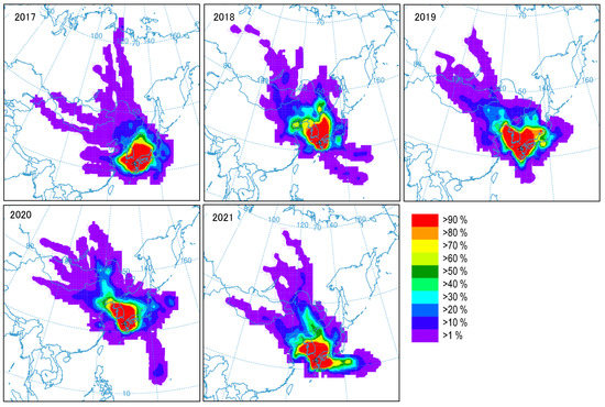 Frequency of residence of back trajectories in a grid cell in winter calculated by HYSPLIT Model of the National Oceanic and Atmospheric Administration, USA. The analysis period was set from 30 December–3 February in each year.