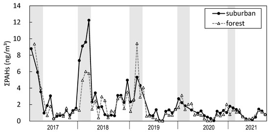 Total PAH concentrations (ΣPAHs) in the suburban and forest sites of Nagasaki from 2017 to 2021. The gray areas indicate winter data.