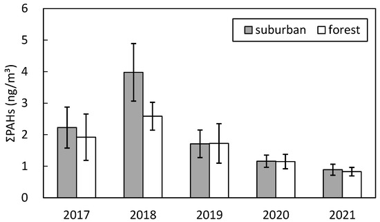 Behaviors in the annual average of total PAH concentrations in the suburban and forest sites of Nagasaki from 2017 to 2021. The error bars indicate the magnitude of the standard error.