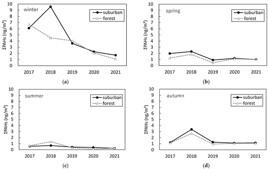 Behaviors in seasonal averages of total PAH concentrations in the suburban and forest sites of Nagasaki each year from 2017 to 2021: (a) winter; (b) spring; (c) summer; (d) autumn.