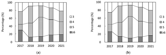 Figure 9 shows the results arranged by the ring number of PAHs to investigate whether there is a behavior in the general types of PAHs for each research year. The suburban and forest sites yielded similar results, which supports the idea that they were influenced by similar sources. In the last 4 years, 4- and 5-ring PAHs have been abundant, while few 3-, 6-, and higher-ring PAHs have been reported. This behavior is similar to that observed in a long-term survey report in Japan [24,26]. There was no clear relationship between the number of rings and the recent decreasing behavior in PAH concentrations in Nagasaki. Although the results are not shown, there was no clear relationship between the number of rings and decreasing concentrations of PAHs in the seasonal analysis.