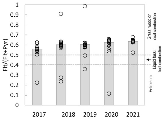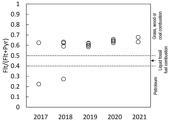 Figure 11 is a graph plotting each year by extracting and calculating only winter values, when PAH concentrations were higher. Figure 11 shows that the source category was sometimes “petroleum” in 2017 and 2018, but overall, as in Figure 10, the source category would be “grass, wood, or coal combustion” even when looking at winter alone. This could relate to the less advanced environmental measures in 2017 and 2018, whereby there were contributions from a variety of sources, including “petroleum”, but from 2019 onward, contributions from such sources decreased. It also shows that biomass combustion and coal combustion remain considerable despite the advancements in recent years. Overall, the concentration of PAHs has decreased in Nagasaki in recent years, but the Flt/(Flt + Pyr) index indicates that there was no significant change in the attributes of the sources. This result is consistent with that of previous studies [19,24,32].