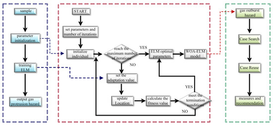 As shown in Figure 1, the WOA algorithm is used to optimize the ELM when predicting the risk of coal and gas outburst. First, initialize the ELM and WOA. ① The input weights and offsets randomly generated by the ELM are used as the initial position vectors of whales for iterative optimization. ② The output of ELM training is used as the fitness value of the WOA algorithm, and the optimal whale position is finally obtained through training. ③ The input weight and offset value of the WOA algorithm output are substituted into the ELM for training, and the accurate prediction value of coal and gas outburst is finally obtained. Secondly, take the gas outburst risk level as the retrieval basis, retrieve, and match, the historical cases similar to the current situation in the database, reuse the cases according to the similarity threshold, and propose measures and suggestions for the present gas risk. Finally, the current case is stored or modified according to the comparison between the current situation and the case similarity in the case base.