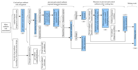 According to the Regulations on Prevention and Control of Coal and Gas Outburst and Coal Mine Safety Regulations [35,36], the coal and gas outburst prevention and control process can be divided into four stages, as shown in Figure 4. Ten workflows in these four stages may generate unsafe behaviors based on this analysis of 150 gas outburst accident reports from 2008 to 2021. Unsafe behaviors can be classified into 27 categories, as shown in Table 3.