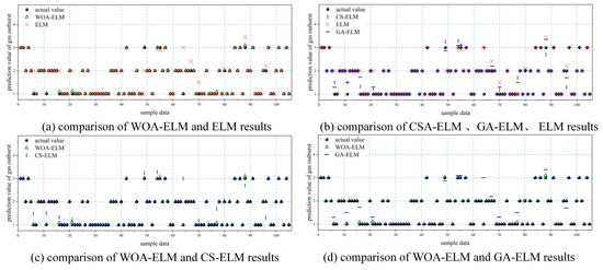 Figure 5a compares the prediction results and actual values of the WOA-ELM and the ELM models. It can be seen from the comparison that the prediction results of many samples after ELM model training deviate from the actual values. In contrast, the prediction results of the WOA-ELM model are closer to the actual values [33]. Figure 5b compares the predicted results of the ELM model, the GA-ELM model, and the CS-ELM model and the actual values. It can be seen that the distance between the predicted results of the GA-ELM model and the CS-ELM model and the actual values is small, which indicates that the accuracy of the ELM model has been improved after optimization. It can be seen from the comparison between the predicted values of the WOA-ELM, the CS-ELM, and the GA-ELM and the actual values in Figure 5c,d that the WOA-ELM model is more accurate, and the data in Table 9 can also prove this conclusion.
