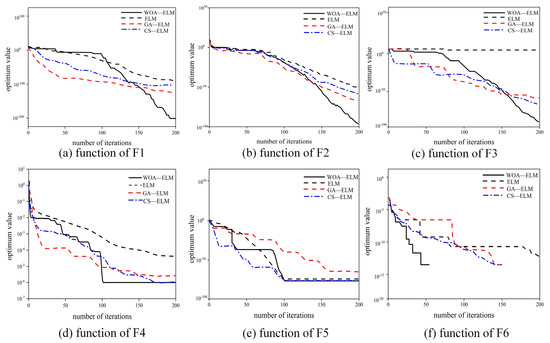 To further verify the optimized performance of the ELM model, six benchmark test functions are selected for testing, as shown in Table 11, where are single-peaked functions, and is a multi-peaked function. The roles of single-peaked and multi-peaked processes are different. The single-peaked function can verify the development ability of the algorithm, while the multi-peaked function can verify the global exploration ability of the algorithm.