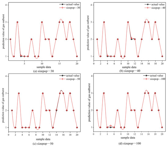 Predicted values of gas outburst risk from WOA-ELM model with different size pop.