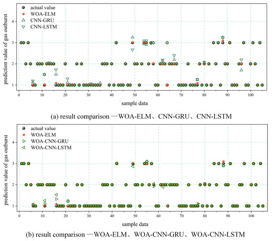 In order to further verify the performance of the proposed model, four models—the CNN-GRU, the CNN-LSTM, the WOA-CNN-GRU, and the WOA-CNN-LSTM are used to predict the gas outburst risk of the data collected in this paper. When using the WOA model to optimize the CNN-GRU, the CNN-LSTM, and the two models, the WOA algorithm is mainly used to find the best location. The best six-dimensional vector of each whale is taken as the structural parameter of the CNN. The prediction results of the four models and the WOA-ELM model are shown in Figure 8. The models are compared in MAE, SSE, R2, MRE, and running time. The results are shown in Table 14.