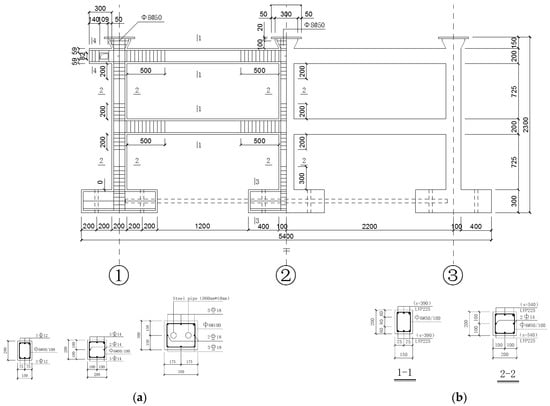Dimension and steel details of frame specimens (Unit: mm). (a) KJ-1. (b) KJ-2.