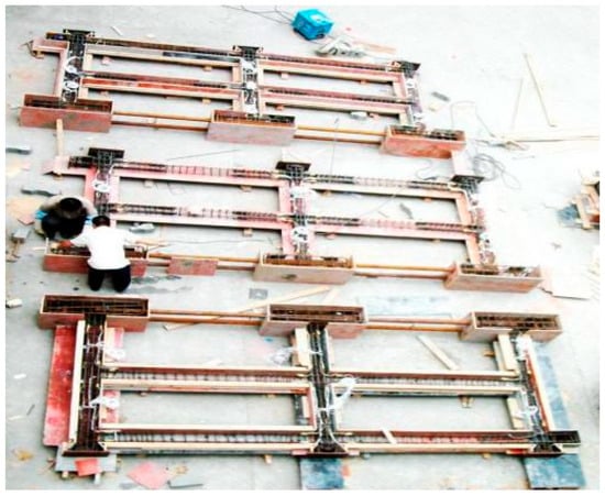The bearing capacity, axial compression ratio, reinforcement ratio of stirrups, the cross-sectional area of each member, and concrete strength grade of the frame are the same. The reinforcement of the test piece is shown in Figure 1 (Unit: mm). The design strength grade of three 1/3 double-layer double-span reinforced concrete frames is C35. The specimen numbers are KJ-1, KJ-2, and KJ-3, respectively. Table 1, Table 2, Table 3 and Table 4 show the information and section parameters of specimens.