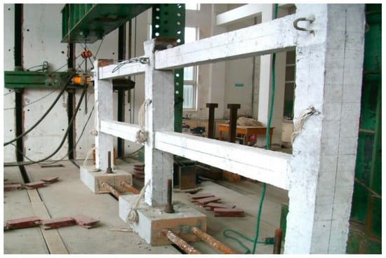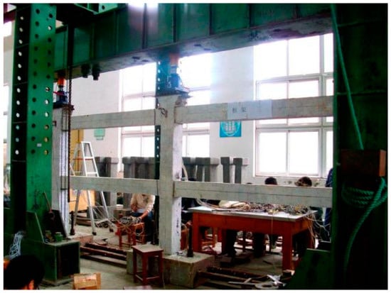The vertical load was applied to the pressure design value in stages through three hydraulic jacks fixed on the top of the frame column. The horizontal load was realized by MTS multi-channel coordinated loading test system. The rated loading capacity of the actuator was 250 kN and the maximum stroke was ±100 mm. The loading device is shown in Figure 5. A schematic diagram of the frame and panorama of framework are shown in Figure 6 and Figure 7, respectively.