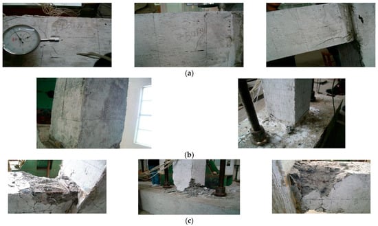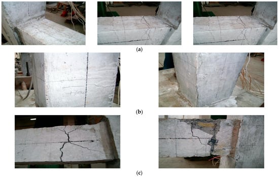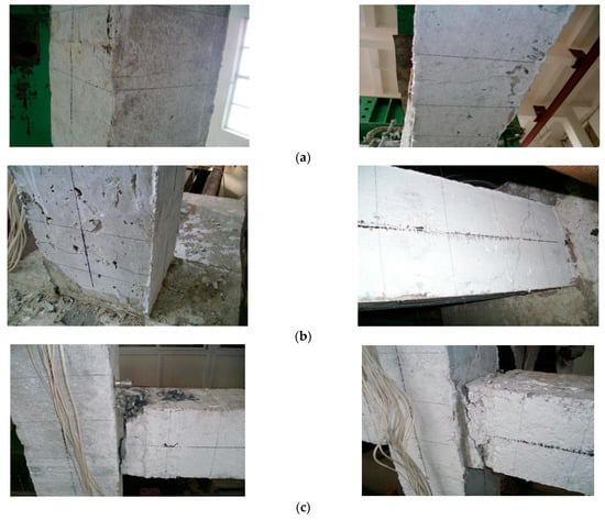 Experimental phenomenon diagram of KJ-2. (a) Cracks in the beams of KJ-2. (b) Cracks in the bottom of columns of KJ-2. (c) Failure modes of KJ-2.