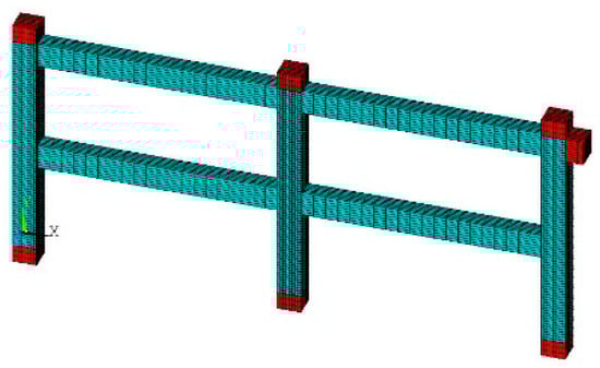 The grid diagram of model is shown in Figure 15.The force damage simulation of the test process was carried out by the finite element software ANSYS15.0 and compared and analyzed with the test results to check and optimize the test results to some extent. Based on the characteristics of the test components and the need to simplify the model and improve operational efficiency, the following basic assumptions were followed in the course of this analysis: (1) The deformation of the member cross-section after the test frame has been stressed still satisfies the flat section assumption; (2) good bonding between reinforcement and concrete without relative slippage; (3) disregarding the axial tensile strength of the concrete and ignoring the mechanical bite between the aggregates after its cracking; (4) the reinforcement had no transverse shear effect, ignoring the transverse shear deformation of the frame or the torsional effect generated during the test.