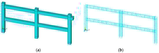 Model of the frame. (a) Geometrical model for the concrete. (b) Model for the steel framework.