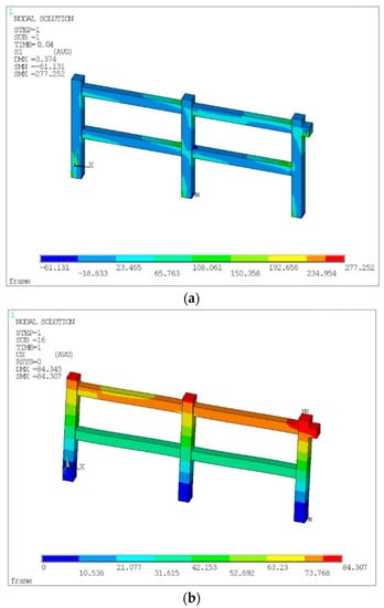 We performed finite element simulations on three-bay frame specimens. The analysis results of KJ-3 are shown here. The stresses in the frame at the ultimate load are shown in Figure 17a, the displacements of the frame in the x-direction are shown in Figure 17b, and the cracks are shown in Figure 17c.