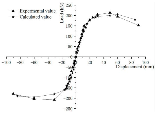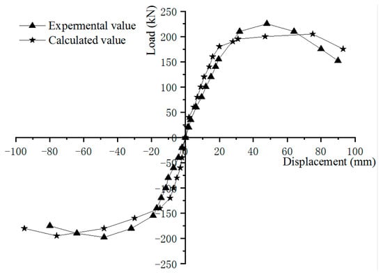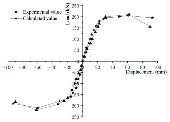 The comparison of the load-displacement curves obtained from the finite element analysis of the three specimens and those obtained from the tests are shown in Figure 18, Figure 19 and Figure 20, respectively. From the analysis of the figure, it can be seen that from the load-displacement curve as a whole, the two trends were generally consistent. Due to the discrete nature of the material itself and the different test methods, as well as the error during the test and the different values of the parameters during the finite element analysis, there are still some differences between the experimental results and the finite element analysis results. However, the overall trend can still be consistent with the experimental results, it indicates that the finite element simulation analysis can be used to better guide the test in the pre-test of future frames.