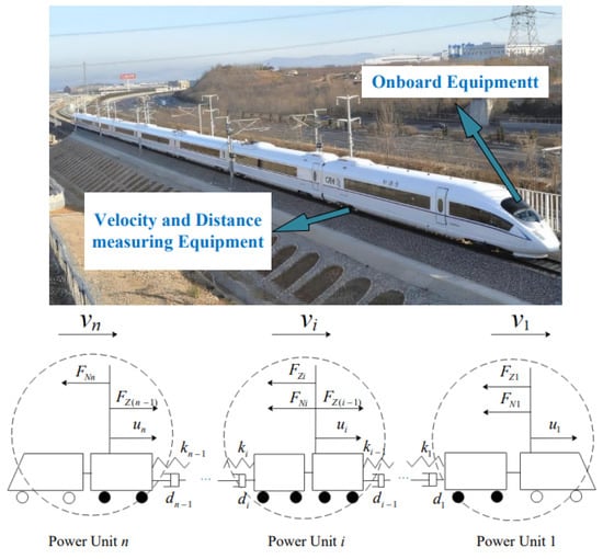 u i ( i = 1 , , n ) is the traction/braking force generated by the power unit i under different working conditions of the train; m i ( t ) , v i ( t ) , x i ( t ) is the mass, speed, and displacement of power unit i, respectively; F N i ( t ) is the basic resistance of power unit i; a i , b i , c i are the operating resistance coefficients; F Z i ( t ) is the force between power unit i and power unit i + 1 , k is the elastic coefficient of the adjacent power unit, and d is the damping coefficient.