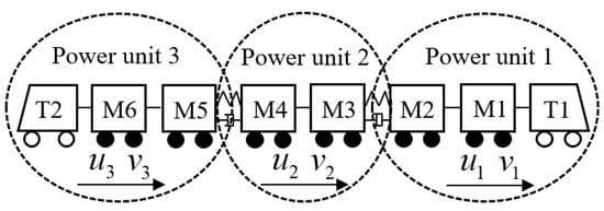 Taking the CRH380A EMUs (with six motors and two trailers) as the object for research, which has three independent traction power units (T1 + M1 + M2, M3 + M4, M5 + M6 + T2), and the grouping is shown in Figure 2.