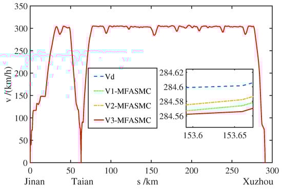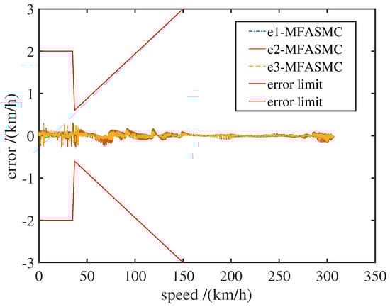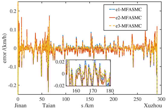 Figure 5 is the speed-displacement tracking curve of each power unit by MFASMC method, Figure 6 is the speed tracking error curve, and Figure 7 shows the corresponding velocity level error curve. It can be seen that the whole train speed tracking effect using MFASMC method is better, and the tracking error range of each power unit is between [ 0.245 km/h, 0.175 km/h], which meets the speed tracking accuracy requirement. According to CTCS-3 [30] (China Train Control System Level 3) speed error requirements (that is, speed error range should be ≤30 km/h, no more than ± 2 km/h; when the speed is greater than 30 km/h, it should be within 2 % of the speed). In addition, the speed change of the EMUs from Tai’an to Xu’zhou East is stable and the error fluctuation is small.