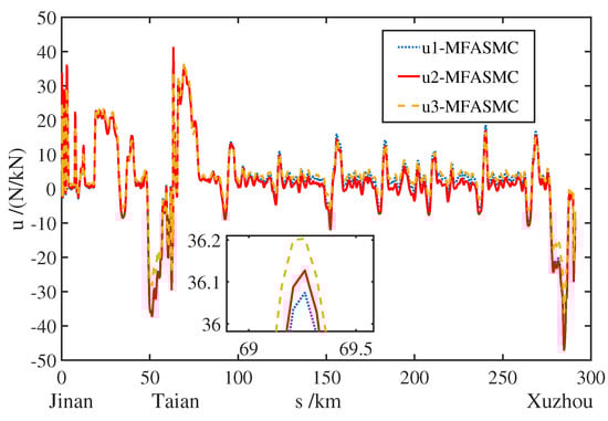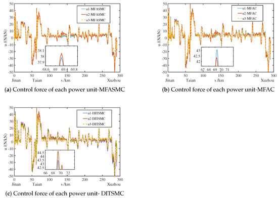Figure 12 shows the unit control force curves of MFASMC, MFAC, and DITSMC. The unit control force range of each power unit of MFAC and DITSMC is between [ 53 N/kN, 48 N/kN] and [ 54 N/kN, 50 N/kN], respectively, and the control force of MFAC changes frequently and is greatly affected by external disturbances. The control force of MFASMC is relatively stable, and the amplitude is smaller than that of MFAC. The unit control force range of each power unit is between [ 49 N/kN, 44 N/kN].