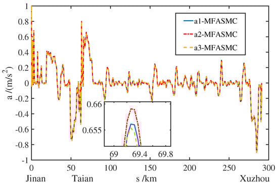 Figure 13 shows the acceleration curves of MFASMC, MFAC, and DITSMC. It is not difficult to see that the acceleration of MFAC and DITSMC methods changes too fast, and the range is between [ 1.045 m/s2, 0.947 m/s2] and [ 1.056 m/s2, 1.024 m/s2]. The acceleration of MFASMC’s high-speed EMUs changes gently, ranging from [ 0.942 m/s2, 0.858 m/s2], which meets the comfort requirements of passengers [31].