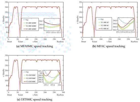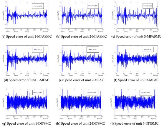 Figure 10 is the speed-displacement tracking curve of each power unit of MFASMC, MFAC and DITSMC, and Figure 11 is the corresponding speed tracking error curve. Due to the addition of external disturbances, the control performance of MFAC and DITSMC methods is greatly affected, and the convergence is difficult to guarantee. In most of the road sections, the tracking error range of each power unit of MFAC is between [ 0.474 km/h, 0.468 km/h], and the tracking error range of each power unit of DITSMC is between [ 0.528 km/h, 0.513 km/h]. However, when passing through special road sections, due to the rapid change of expected speed, the errors of MFAC and DITSMC can only be stabilized between [ 1.247 km/h, 1.348 km/h] and [ 0.851 km/h, 0.762 km/h], respectively. In contrast, MFASMC uses the discrete sliding mode exponential reaching law to further ensure convergence. The tracking error range of each power unit is stable between [ 0.251 km/h, 0.206 km/h], which is less affected by disturbance and meets the speed tracking accuracy requirements.