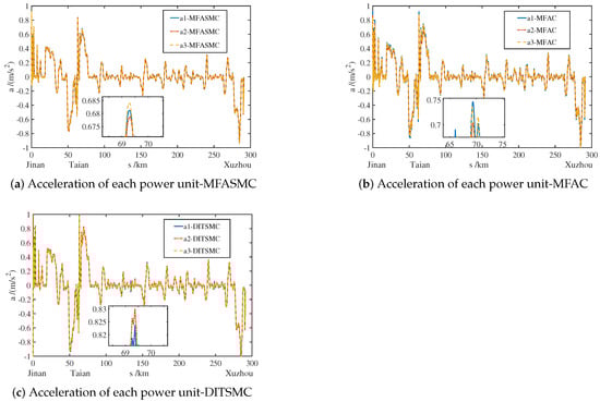 Figure 8 is the control force change curve of each power unit using the MFASMC algorithm. The control force range of each power unit is between [ 47 N/kN, 41 N/kN], and the working condition switching process is relatively stable. Figure 9 shows the acceleration curve of each power unit. The acceleration range of each power unit is between [ 0.923 m/s2, 0.812 m/s2]. The acceleration change is stable, which can meet the comfort standard of the train operation.