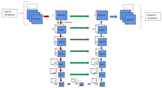 The U-net architecture was first proposed for computer vision for biomedical image segmentation and is a convolutional encoder-decoder deep regression framework [44]. The encoder is used to capture context, while the decoder makes high-resolution pixel-wise predictions called contracting path and expanding path, respectively. A skip connection structure is mainly used in this architecture to combine the features from the contracting path with the upsampled part from the corresponding expanding course.