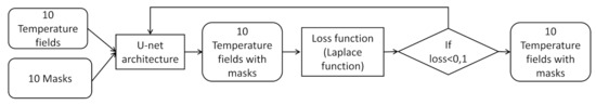The multiple cases training is shown in Figure 2. Ten temperature fields and ten masks are the two inputs of the U-net architecture. Then, the backpropagation process calculates the loss function’s gradient and updates the multilayer CNN’s weights to satisfy the loss function, which is the residual of the Laplace equation. Finally, when the threshold of the loss function is reached, accurate field solutions are generated.