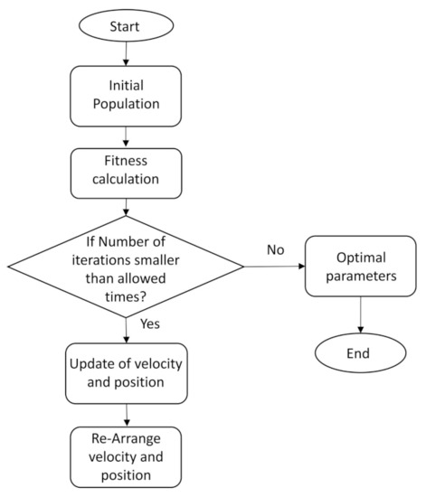 The feasibility of this method has been proved in many scientific and industrial fields [55,56,57,58,59,60,61]. PSO requires a solution space conventionally achieved by discrete methods by optimizing the algorithms. There are multiple boundary conditions and multiple inputs when considering complex optimization goals. The effort of accompanying numerical simulations is usually prohibitive [62]. The particle swarm optimization (PSO) algorithm is an emerging optimization technology whose ideas originate from artificial life and evolutionary computing theory. Particle swarm optimization completes the optimization by the particles following the best solution found by themselves and the best solution of the entire swarm. Compared with other evolutionary algorithms, this algorithm is simple and easy to implement, has few adjustable parameters, has stronger global optimization ability, and has been widely studied and applied [63,64]. Similar to the simulated annealing algorithm, PSO starts from a random solution and finds the optimal solution through iteration. It also evaluates the quality of the solution through fitness but has simpler rules than the genetic algorithm. PSO does not have the “crossover” and “mutation” operations of the genetic algorithm. It finds the global optimum by following the currently searched optimum value.