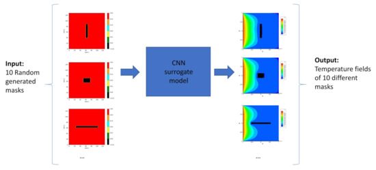 The CNN surrogate model, which is shown in Figure 4, is used for the optimization tasks described in the next section. The finite element method FEM model can provide an accurate temperature prediction for heat transfer. However, the optimization based on the FEM model could be infeasible, as discussed above. The FEM can only provide solutions with precise boundary conditions and layouts. Therefore, the result is not given in an explicit form. The PD-CNN model, in contrast, is an accurate mapping between the layouts and corresponding solutions and can predict the temperature distribution for any randomly given geometry. Therefore, a CNN surrogate model could be a suitable choice for layout optimization. Figure 4 shows the input and output of the CNN surrogate model in the case of four holes. Ten randomly generated masks are used as the input for the CNN surrogate model during every epoch. The masks also change with different epochs.