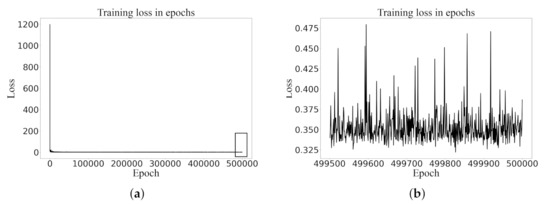 As shown in Figure 5a, the Laplace residual value drops exponentially in the beginning; after approximately 20 iterative steps, the convergence of the Laplace residual exhibits minor differences. When the iterative training step reaches 500k, the value decreases to be sufficiently small. After then, the Laplace residual oscillates around 0.35, as shown in Figure 5b, which is considered converged. The whole converge curve is very similar to the curve using the combined data- and physics-driven the method in Ref. [41]. The training process with 500,000 epochs requires around 9 h using the following device: Intel Core i5-10300H CPU and NVIDIA GeForce RTX 2060.