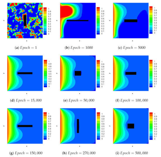 As shown in Figure 6, the mask changes in every epoch in the learning process, and the contours of the temperature field become smoother. As the advantage of physics-driven learning, the relation of adjacent points is constrained by the Laplace equation. For this reason, the values do not vary dramatically. Then in epoch 1000, a significant error spot appears, denoted as a peak in which the value is round 3, see Figure 6b, and the residuals near the domain’s boundaries are negative. The whole temperature field is much different from the proper solution. Finally, from epoch 15,000, the global structure is stable and very similar to the proper solution after the gradual disappearance of the peaks. However, there are still residuals near the boundaries of holes, which is a specific numerical solution to an unsteady heat conduction problem with a Dirichlet boundary condition [41]. In the validation phase, the surrogate model can predict the temperature field immediately. As the results presented in the next section, the prediction of the PD-CNN surrogate model is almost identical to numerical simulation results.
