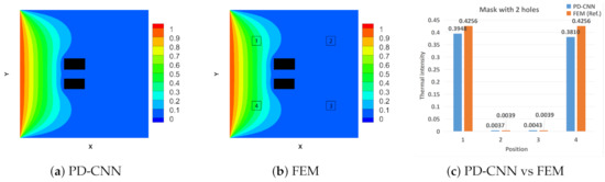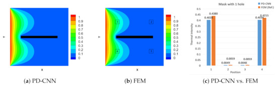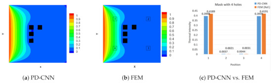 Figure 9a shows the temperature field with four optimized masks using the PD-CNN method. The area of each hole is fixed as 10 × 10, and the central position of each hole is movable from the center of the plate. Four masks were in the same position, which means they were coincident initially. The movement of each mask’s coordinate x and y ranges from −20 to 20. We notice that three holes are arranged vertically in the middle and left part of the entire domain, and the fourth mask is located on the right and upper of the whole field as shown in Table 4. Considering the symmetry of the computational domain, we can easily infer the distribution of another solution: the top hole is on the right upper side. In addition, in this case, we can see the numerical difference distribution similar to the previous two instances from Figure 9c. The only difference is that the temperature values obtained by the PD-CNN have residuals in the four corners. The reason is that the calculation is more complicated in the case of four holes, and the convergence speed will decrease. Still, as the number of training increases, this residual will gradually disappear.