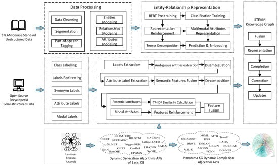 The dynamic construction of STEAM’s interdisciplinary knowledge graph is reflected not only in the integration and openness of its encapsulation algorithm library API, but also in its intelligent configurability of the knowledge graph of various disciplines, which is specifically divided into the core stages of multi-disciplinary knowledge fusion, representation, completion, error correction, and update. Multi-discipline knowledge fusion refers to entity alignment and attribute fusion of multi-group and multi-discipline knowledge data. In addition to the above basic tuple elements such as “head entity—relational predicate—tail entity”, the multi-group data processed by the multi-disciplinary knowledge extraction algorithm also contain multi-group knowledge mixed with other language elements, such as time, place, degree modifier, etc. In order to realize the standardized semantic storage, linking, reasoning, etc., of the multi-group knowledge, it is necessary to regularize the tensor decomposition of the mixed elements in the multi-group; the knowledge representation is further matched with the triple representation in the current discipline knowledge graph so as to build a discipline knowledge graph configuration unit with a standardized data format, clear semantic association, and multiple reasoning paths. The representation of multi-disciplinary knowledge refers to the problem of how to map the expression forms of various multi-disciplinary knowledge in different cognitive intelligence fields. The multi-disciplinary knowledge in the learner’s cognitive intelligence development field is represented as symbolic information, and the multi-disciplinary knowledge in the machine’s cognitive learning intelligent field is represented as vectorized information. The disciplinary knowledge graph itself becomes the interface between the knowledge symbolic representation and vectorized representation to meet the needs of knowledge flow and integration in their respective fields. The completion, error correction, and updating of multi-disciplinary knowledge is a mechanism for the collaborative optimization of multi-disciplinary knowledge quality in the process of data fusion and the representation of graph corpus between learners and machines during multi-disciplinary learning. On the one hand, it dynamically updates the semantic relationship of associated conceptual entities among disciplines by encapsulating and integrating various panoramic knowledge graph completion algorithms’ API, and it promotes the configuration and integration of discipline graphs. On the other hand, through the joint training and learning of large-scale corpus semantic data, we can detect the logical fallacy of semantic relations between different entities and update knowledge cooperatively, so as to build a cognitive intelligence dynamic architecture for the appropriate instructional design of STEAM themes.