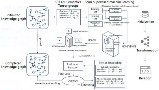 The STEAM interdisciplinary knowledge graph has an interdisciplinary and multi-level cognitive development path. It aims to cultivate learners’ multi-clue and multi-dimensional problem-solving thinking and ability. The dynamic completion of the disciplinary knowledge graph provides an intelligent cognitive framework for teachers to carry out interdisciplinary instructional design. It also enables learners to construct multi-personalized meanings for multi-disciplinary learning tasks. The completion of the STEAM knowledge graph refers to using the tensor decomposition model to convert the data of various topic maps that are related to each other or have a learning order (before and after knowledge) into a data form that is easy to be processed by the computer. Next, the semantic relationship between the subject knowledge points is mined to predict and embed the potential semantic relationship between new and old knowledge entities or their attributes. Finally, the intelligent and dynamic completion of the subject knowledge graph is realized. According to the knowledge learning path of different disciplines of STEAM, the completion path of a STEAM knowledge graph also presents multiple dynamics.