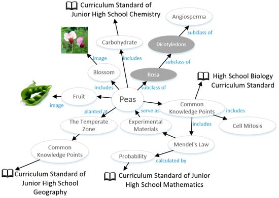 The learners are the first year students of the experimental high school. During the course of project learning, they are divided into a pea science and technology research group and a pea culture exploration group, according to the learners’ cognitive preference style. Under the activity mode of group cooperation, they carry out personalized learning and research on the related scientific principles, agricultural technology, horticultural culture, literary works, and other sub-topic keywords of pea, respectively, with the support of the subject knowledge graph. Its subject learning theme keywords take “pea” as the central word, “scientific principles, agricultural technology, horticultural culture, and literary works” as the clues of knowledge and resource organization and management, and learners’ cognitive style preferences and state attributes as the sequence feature tags to dynamically generate multi-disciplinary learning paths and resource allocation sequences under different cognitive style tags. The knowledge structure system based on the corresponding subject curriculum standards dynamically retraces the semantic relationship between the old knowledge and the new knowledge of learners, and it maps the hierarchical characteristics of cognitive ability between the learning sequence of learners’ knowledge and the sequence of resource organization, so as to realize personalized multi-disciplinary intelligent learning. Finally, under the support of the subject knowledge graph, the learners are guided to dialectically understand the cooperative development relationship between crop science and technology and human farming culture through group communication and sharing. This section takes the STEAM instructional activity of Exploring the Scientific Principles of Peas as an example to show the dynamic generation effect of interdisciplinary knowledge graphs based on the curriculum standards of chemistry, biology, geography, and mathematics. The generated STEAM interdisciplinary thematic knowledge graph is shown in Figure 3.