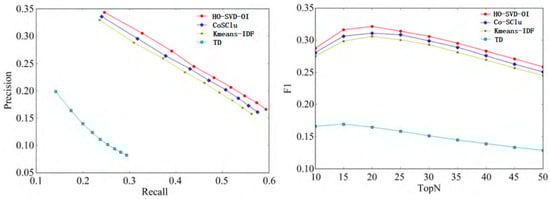 In the training set data, the corresponding TopN list of each learner was calculated by the multi-disciplinary semantic tensor decomposition algorithm HO-SVD-OI in this section. The accuracy recall curve was used to reflect the changing trend of the accuracy of the method in this paper and the mainstream classical algorithm in matching STEAM learning topics with course standards, and the performance gap of different algorithms was reflected by the harmonic mean F1 index [29]. In this section, we selected the Kmeans IDF algorithm [30] based on semantic tags and K-means clustering of user access resources, the classical tensor decomposition Co SClu algorithm [31] based on semantic tag co-occurrence spectrum clustering, and the classical TD algorithm [32] based on original tensor decomposition as the reference comparison algorithm.