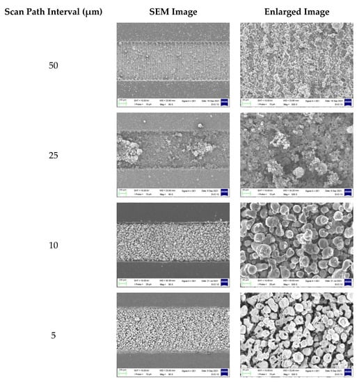 Figure 3, which affects the overlap rate in the pick-feed direction. If the overlap ratio is low, an interconnection between metal powders becomes difficult. Conversely, if the overlap ratio is excessively high, thermal damage to the entire specimen may occur. In this study, because a beam shaper was not separately used, the laser spot followed a Gaussian distribution so the energy distribution of the entire patterning area could only be evenly made when an appropriate overlap ratio was applied. Therefore, we conducted the experiment whilst varying the scan path interval from 1.25 to 50 µm.