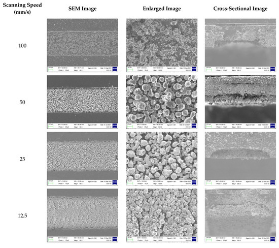 Figure 8, when the scanning speed was 100 mm/s, which was a low overlap ratio, an interconnection between the powders was not formed at all and only the ablation phenomenon was observed. On the other hand, when the scanning speed was 50 mm/s or less, it was confirmed that the polymer binder was ablated and an interconnection between the aluminum powders was sufficiently formed to make a conductive pattern. However, as can be seen from the surface and cross-sectional SEM images, thermal damage occurred in the depth direction and the line edge direction due to an excessive thermal energy superposition. Such unnecessary thermal damage causes an increase in resistance, as described above. As shown in