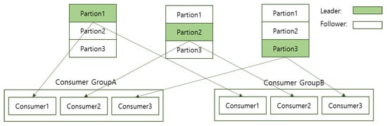 In Figure 6, the TOPIC-partitioned data is transmitted to the server (KAFKA Cluster) and replicated to each broker in the cluster (each partition of the server). Afterward, at the request of the consumer group, each broker in the KAFKA cluster designed a system capable of distributing data and transmitting large amounts of data.