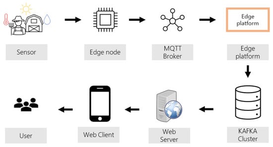 The overall system architecture mainly consisted of several elements, as shown in Figure 1. First, the sensor installed on the IoT node and the cloud/cluster application responsible for the sensor device are required. Second, an MQTT broker collects data acquired from an IoT node and transmits it to the computing platform. Based on the publish/subscribe model, an MQTT broker maintains multiple subscribers, each of which is subscribed to a particular topic, and forwards the data as they are received. Third, the cloud platform in this research served to connect the MQTT and Kafka protocols.