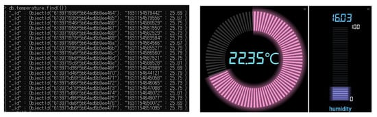 When data is sent through Kafka, consumers of such as databases and web servers consume the data immediately and proceed as follows: After receiving data from the Kafka cluster, data is accumulated through the MongoDB connector. The query result in MongoDB that processes the data received from the Kafka cluster is as follows. The left-side of Figure 8 shows the temperature and humidity values printed at every datapoint received, and the right-side of Figure 9 represents our user interface screen, which depicts the temperature and humidity values graphically.
