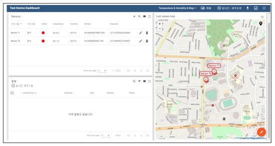 The upper left of Figure 11 provides the name of each sensor node registered in our system and the information collected from that node in real time. It also provides the latitude and longitude of where the node is installed. The right side of Figure 11 shows the location where the sensor node is installed on the map. Therefore, if the IoT facility that the manager wants to monitor is distributed over multiple regions, it is easy to visually check which region the data is coming from.