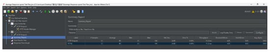 In Figure 14 and Figure 15, we can see the overall information of the performance evaluation performed by JMeter. The figure provides the number of responses, average value, minimum value, maximum value, standard deviation, error rate, bandwidth, received data size, transmitted data size, and average data size.