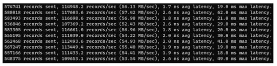 We conducted the test several times by varying the number of client connection patterns and topics. As the time increased, the number of transactions processed was continuously maintained at over 100,000 messages per second. It was suitable for processing and transmitting measurement data occurring continuously in the real environment. As a result of a total of 10 repeated experiments, a minimum of 107,369.2 datapoints could be processed per second, and a maximum of 117,603.6 datapoints per second could be processed. Figure 6 shows part of the experimental result log.