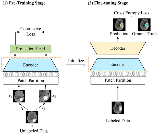 A label-efficient brain tumor segmentation method was proposed in this paper, which combines the advantages of a transformer and contrastive learning, dubbed LETCP (Label-Efficient Transformer-based Contrastive Pre-training); see Figure 1 for details. It contained two stages: pre-training and fine-tuning. The first stage worked with unlabeled data to pre-train the encoder; it picked up the intrinsic representations of brain tumor images by contrastive loss. The second stage took small amounts of labeled data to fine-tune the segmentation model with cross-entropy loss. Please note that the projection head was only used in pre-training, and the encoder after pre-training served as the initialization for the fine-tuning stage.