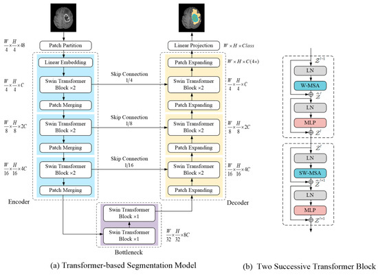 A transformer-based brain tumor segmentation model is presented in this section (see Figure 2a for an overview). To fully exploit the feature extraction capability of the self-attention mechanism inspired by previous studies [15], the segmentation network adopts Swin Transformer as a basic unit and U-shape encoder–decoder structure. The details of each component are described in the following sections.